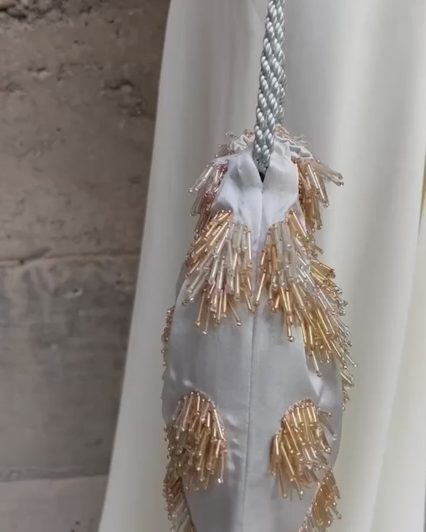 Make a majorly chic and sunny statement in our cream-colored silk evening bag with golden-toned, hand-beaded embellishment and silk twist cord wristlet.