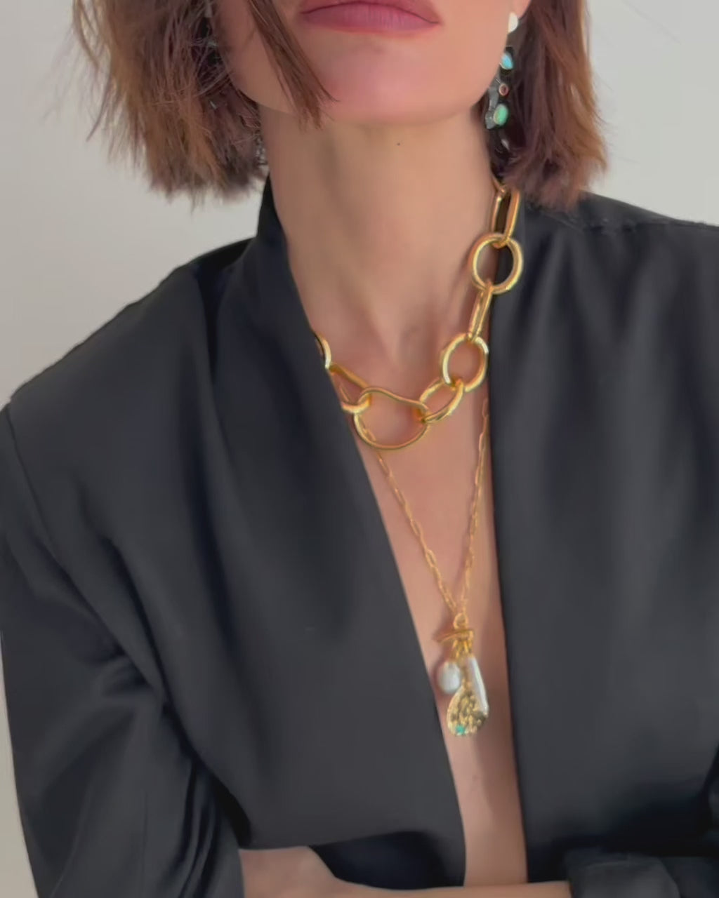 Our love of charm-adorned jewelry is no secret, and this necklace was designed have a truly old-world, heirloom feel. A gold-plated brass paperclip chain with front toggle closure holds a trio of charms: hanging freshwater pearl, stick pearl, and a gold-plated textured coin inlaid with enameled olive branch motif, garnet, chrysoprase, and turquoise stones.
