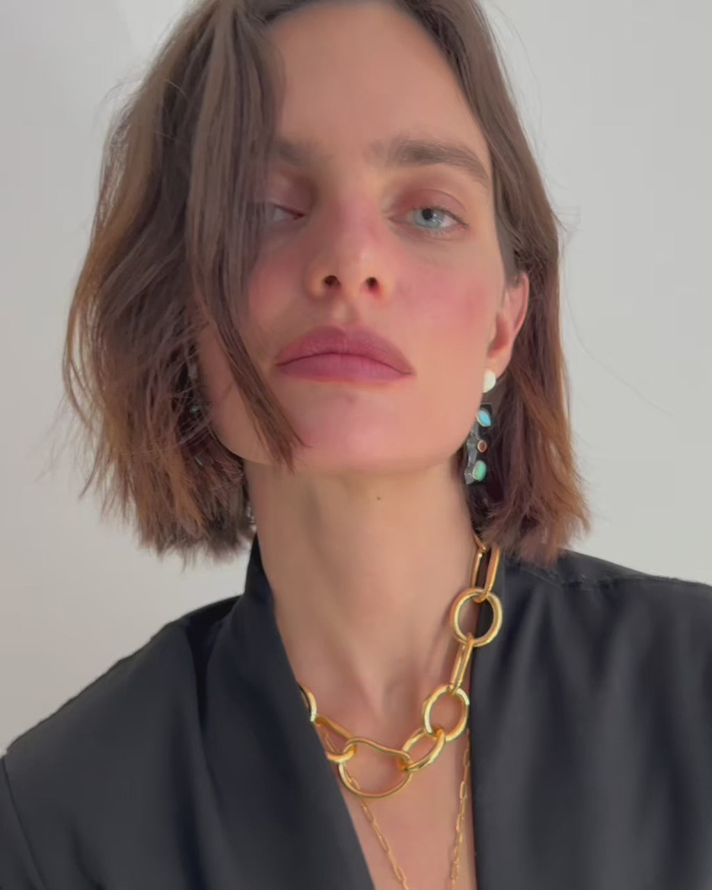 Taking cues from the intricate beauty of Spanish mosaics, we created these artful geometric column earrings with mother-of-pearl tops and hanging resin inlaid with garnet, chrysoprase and turquoise-colored stones.