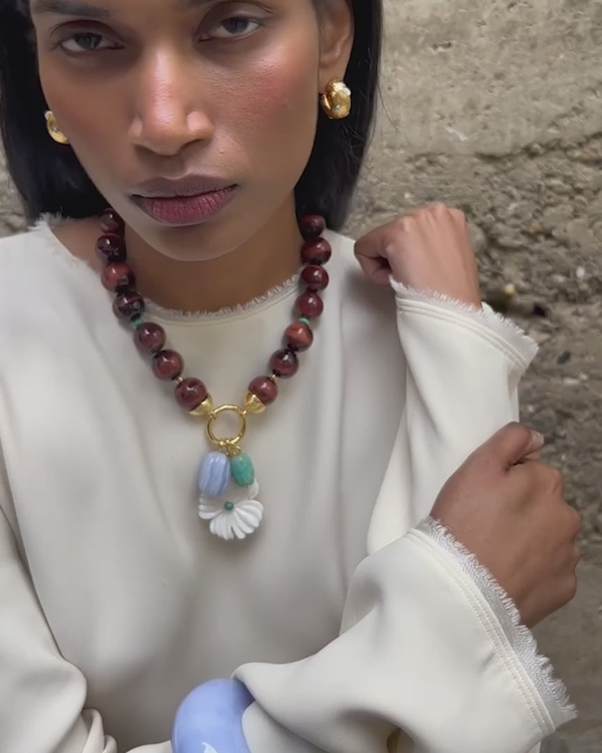Consider this statement necklace your oasis in a sea of boring jewelry. Featuring gorgeous round tiger's eye beads with turquoise accents and a gold-plated brass focal ring with carved blue chalcedony, Peruvian amazonite, and mother-of-pearl flower inset with turquoise cabochon.