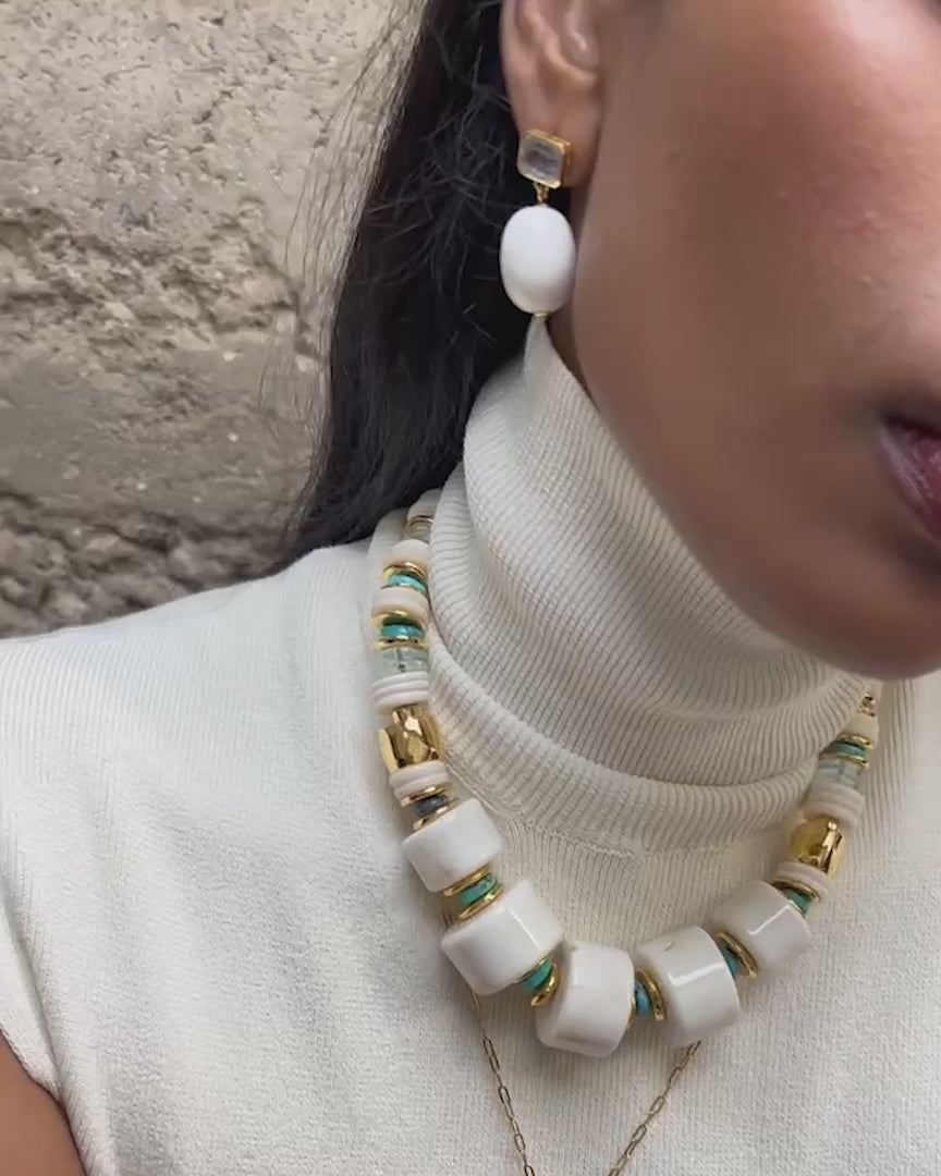 Elemental, sculptural, divine. This gold-plated paperclip chain necklace holds an oblong pendant that feels like a talisman, in handmade, cream-colored ceramic inlaid with semiprecious blue lace agate and fern green topaz stones.