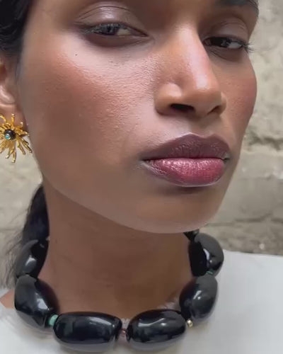 Did we just hear a wolf whistle? Heed the call of the wild in a dramatically oversized black glass beaded statement necklace, dotted with pink and sky blue crystal quartz, chrysoprase, and hessonite garnet accents.