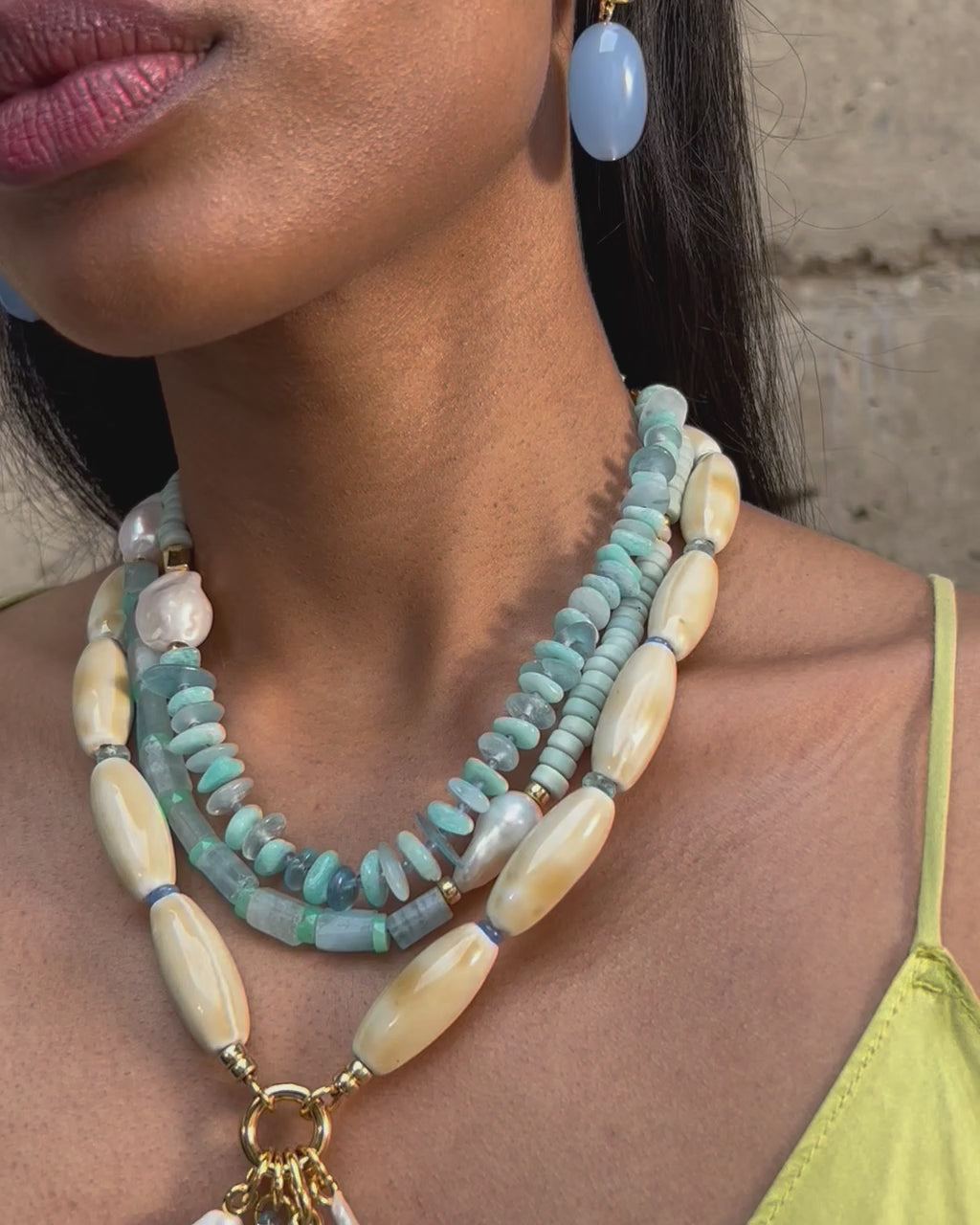 Make a big statement in the Big Sur Earrings, a deceptively simple pair whose serene blue hue really packs a punch. Featuring gold-plated brass and mother-of-pearl tops with hanging oval glass drops.