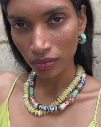Our design team took inspiration from the traditional glazed Zellige tiles handcrafted in Morocco and created these hoops, our freshest new silhouette in gold-plated brass with bright amazonite stone inlay.