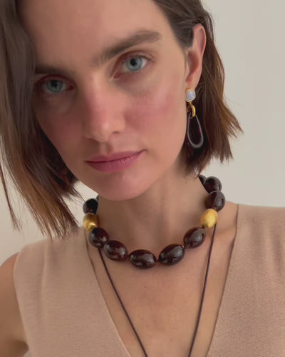 Named for a historic neighborhood in Seville, Spain, Triana is known for its tile and pottery. We designed this supremely elegant collar necklace with this in mind. Comprised of dark brown handmade ceramic beads, with brushed gold-plated accents and closure.