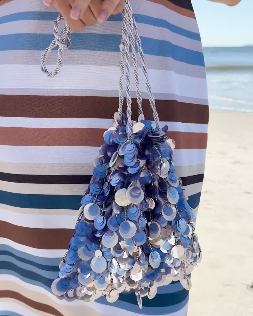 Drape yourself in a shimmery lilac-silver-toned evening bag that's got intrigue and romance to spare. This hand-embellished beauty features hanging mother-of-pearl shell discs, sequins, and a silk twist cord wristlet.