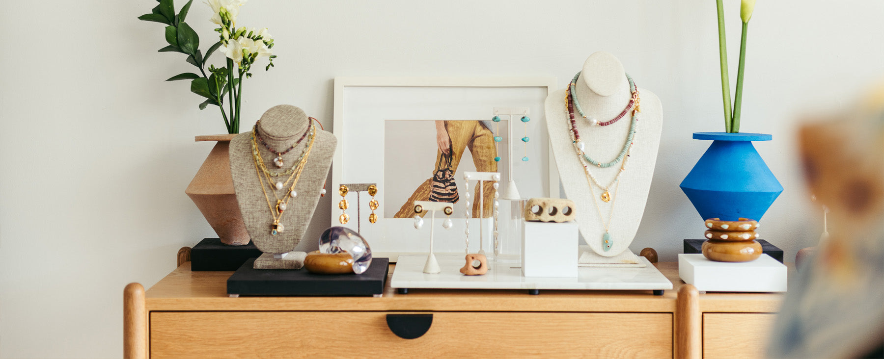 Our collections include hand-crafted statement jewelry, 14-karat fine jewelry, handbags, belts, scarves, and “Fortune Finds” — home decor items that we source from our travels and fellow creatives.Â