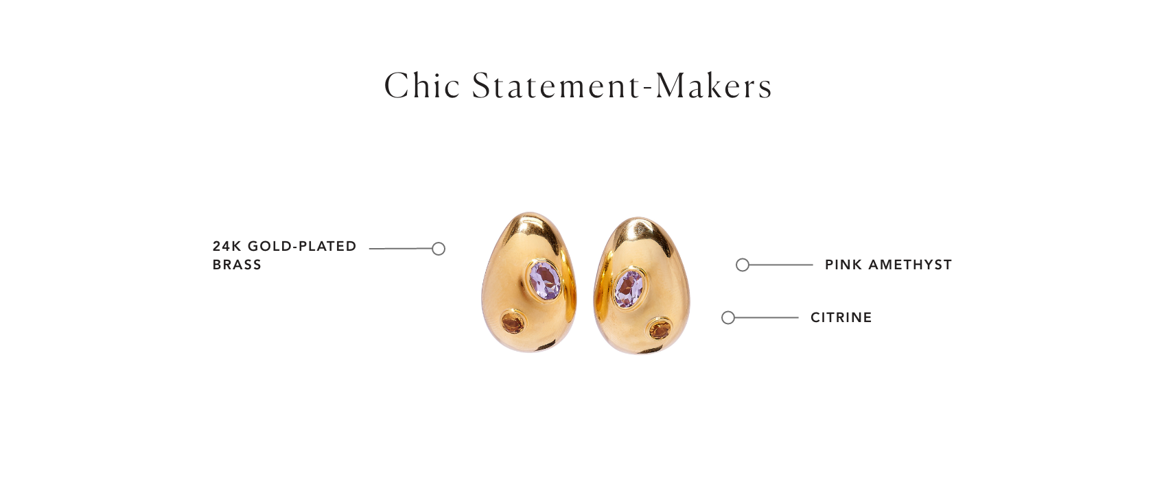Make a smaller (though no less chic) statement in our petite Arp teardrop earrings, suitable for boardroom days to ballet nights. In gold-plated brass and dotted with pink amethyst and citrine stones.