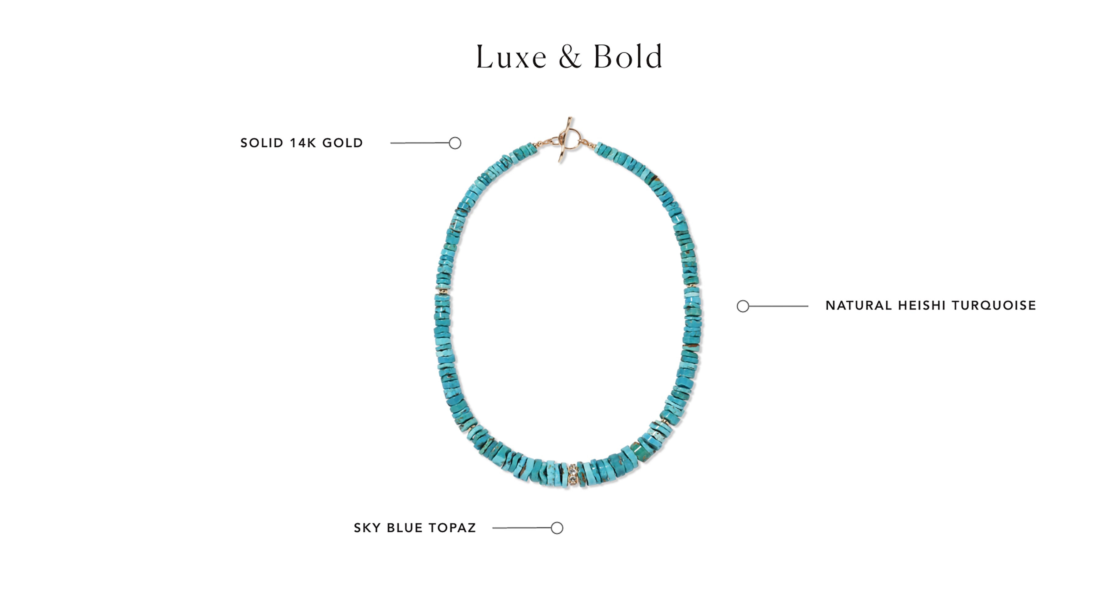 Stop the show in the prettiest necklace of graduated, natural heishi turquoise beads. Featuring a sky blue topaz focal bead and 14k yellow gold toggle and ring closure.