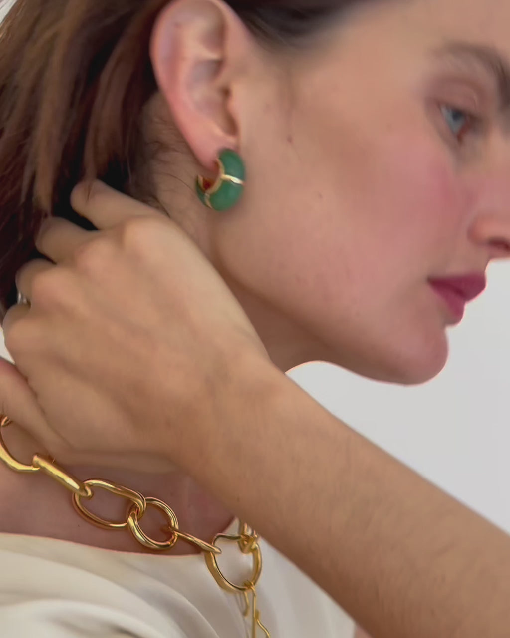 The design team took inspiration from the traditional glazed Zellige tiles handcrafted in Morocco and created these hoops, our freshest new silhouette in gold-plated brass with African jade stone inlay.